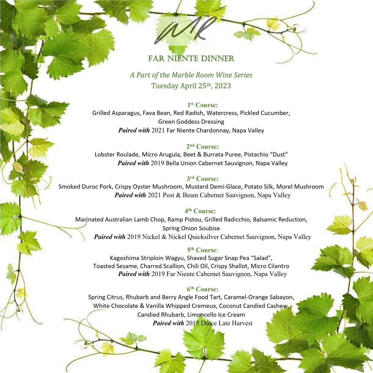 The Marble Room Wine Dinner Series presented a five-course tasting menu in our luxurious Vault. This dinner had two seatings available for New Year’s Eve: 4:30pm-7:30pm and 8:30pm-11:30pm.